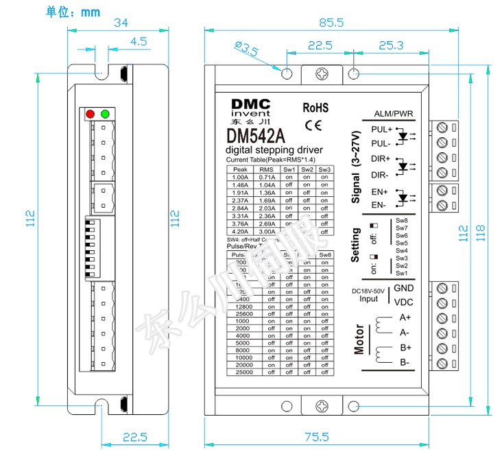 DM542A型驅動器,比M542 具有更低的電機發熱、運行噪聲和更高的平穩性,以及更低的成本,主要驅動42、57型兩相混合式步進電機。其微步細分數有15種,最大步數為25000Pulse/rev;其工作峰值電流范圍為1A-4.2A,輸出電流共有8檔,電流的分辨率約為0.45A;具有自動半流,過壓和過流保護等功能。本驅動器為直流供電,建議工作電壓范圍為24VDC-36VDC,電壓不超過50VDC,不低于20VDCd