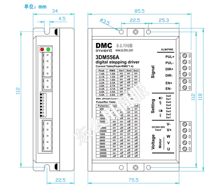 3DM556A型驅動器,具有更低的電機發熱、運行噪聲和更高的平穩性,以及更低的成本,主要驅動57型三相混合式步進電機。其微步細分數有15種,最大步數為25000Pulse/rev;其工作峰值電流范圍為1.4A-5.6A,輸出電流共有8檔,電流的分辨率約為0.7A;具有自動半流,過壓和過流保護等功能。本驅動器為直流供電,建議工作電壓范圍為24VDC-36VDC,電壓不超過50VDC,不低于20VDC。
