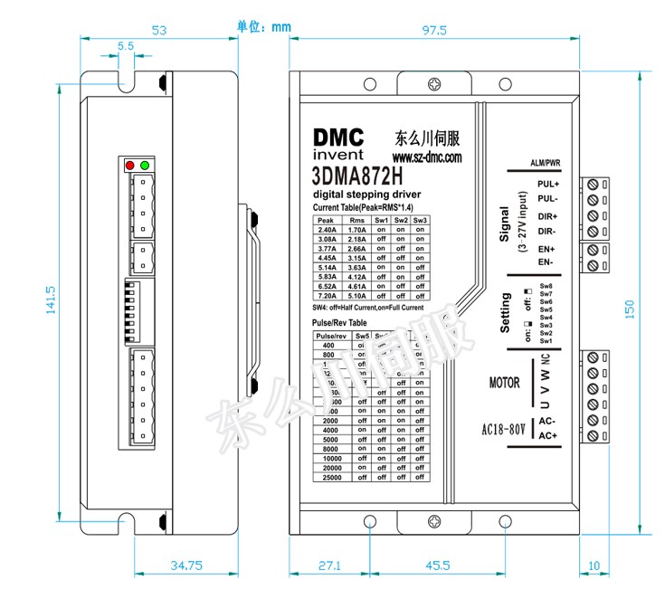 安裝說明  驅動器的外形尺寸為:151×97×53mm,安裝孔距為139mmmm。既可以臥式和立式安裝,建議采用立式安裝。安裝時,應使其緊貼在金屬機柜上以利于散熱。